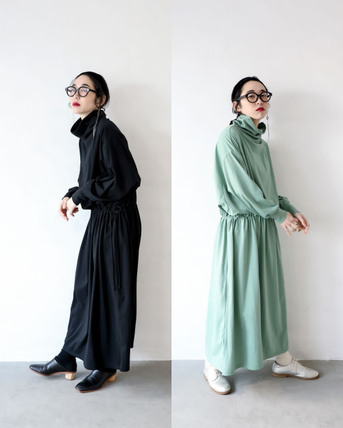 着丈たっぷりのハイネックドレスはウエストのドレープが◎